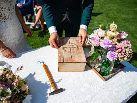 Tijdens de ceremonie lazen Dionne en Tom geloftes aan elkaar voor. Deze deden ze vervolgens in een kistje die ze ter plekke dicht timmerde om over vijf jaar samen open te maken en nog eens samen door te lezen. Bijgevoegd waren ook wat polaroid foto's die ik die dag heb geschoten en een flesje wijn. Super origineel!